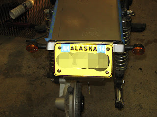 Second, once I installed the rear wheel, I found that the tail light/brake light/turn signal/license plate hangar rubs on the tire. As I was fabricating the part, I was concerned about clearance, and now that the rear tire is reinstalled, it looks like my concerns were well founded. Even with no load on the shocks, the license plate touches the rear tire. I'll have to find a way to point the plate upwards, rather than hanging it underneath the seat. On a positive note, I salvaged a thicker metal strip from the OEM license plate hangar that should work better for securing the tail lights. The tail light bracket I fabricated was a little flimsy; the OEM piece is much beefier. However, I'll have to ream the mounting holes a little bit to get the 10mm bolts on the turn signals to fit.